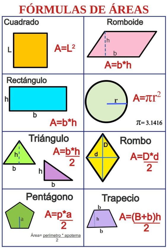 El área de una figura se define gracias a las formulas que se utilizan para calcular el espacio que se encuentra en todo el interior de la figura. La fórmula dependerá de cada figura geométrica como por ejemplo en el cuadrado cuya formula es la de base por altura (bxh).