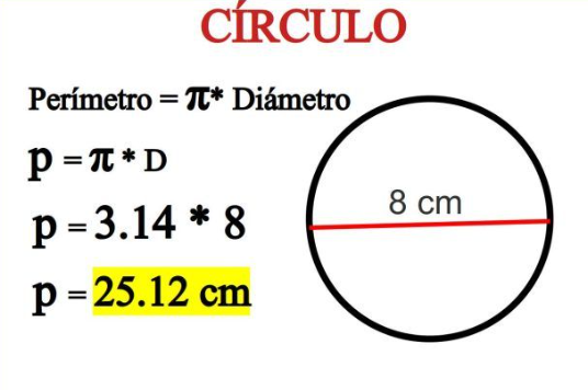 - Circulo: Al no poseer lado y en su lugar una circunferencia, se hace uso nuevamente del número π y el valor del radio. El radio se define como la línea recta que va desde cualquier parte del circulo hacia el punto del centro.