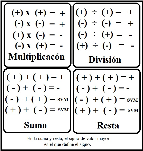 - Multiplicación y División: En estas dos operaciones si los signos son iguales el resultado será positivo, mientras que si son diferentes el resultado será negativo. Esta regla se aplica de igual manera en la división.