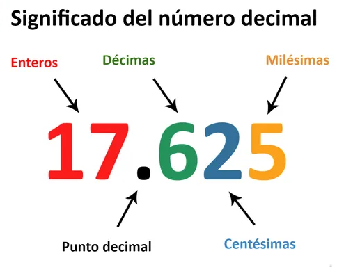 Recordemos que se define como número decimal a un número que NO es entero. Por lo tanto, se compone de una parte entera, una coma (,) y una parte decimal. Esta última parte se funciona para representar un valor más pequeño que el de una unidad.